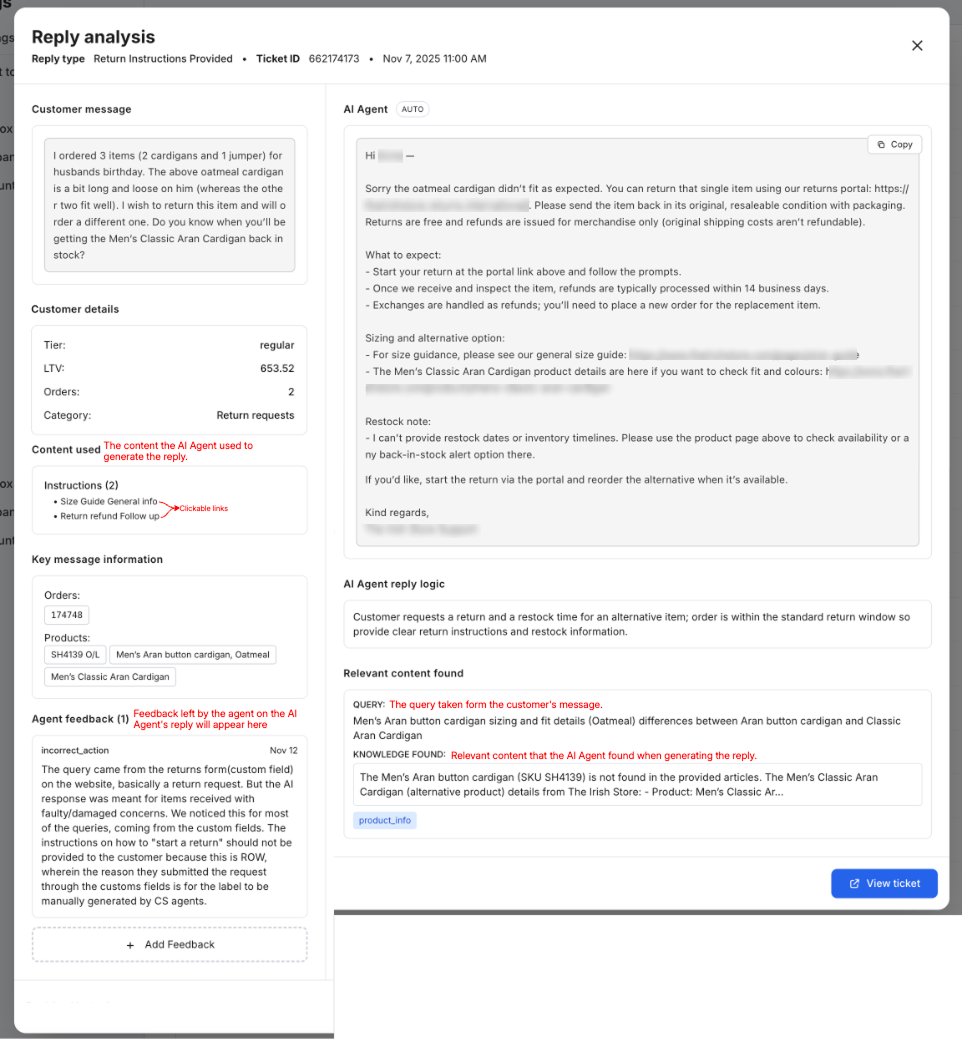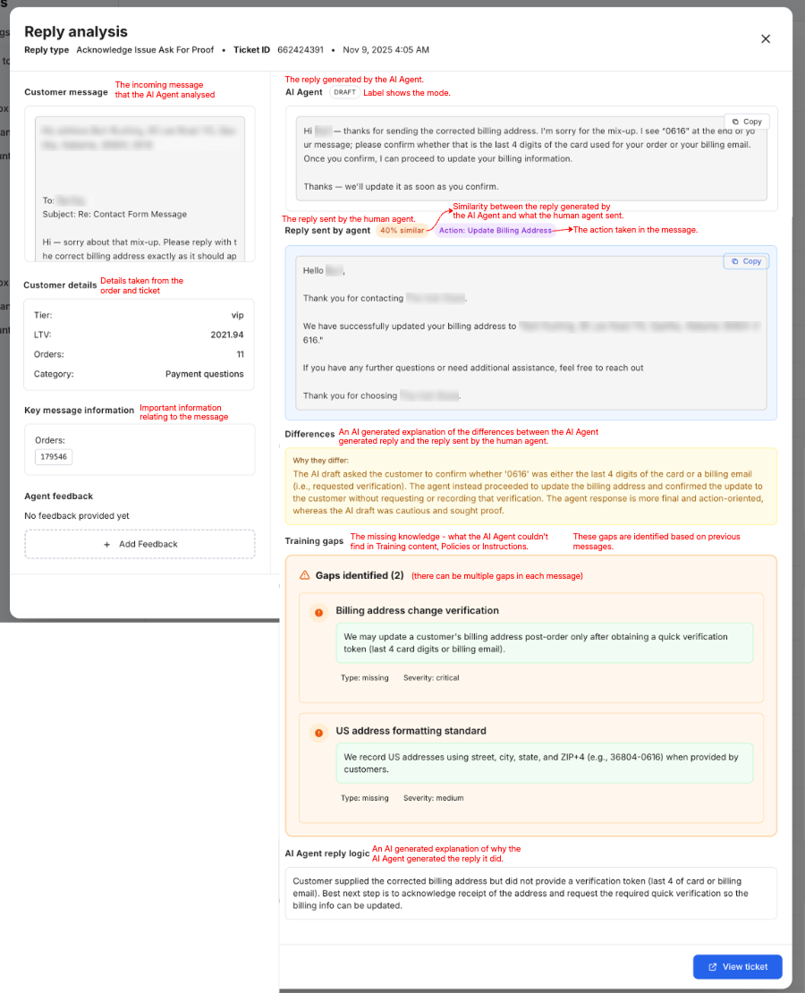 The Reply analysis is a powerful tool that enables you to see how successful the AI Agent was in generating satisfactory answers and handling tickets. It provides in-depth details about the AI Agent's activity for a given message, and also includes the human agent's feedback and actions in that message.