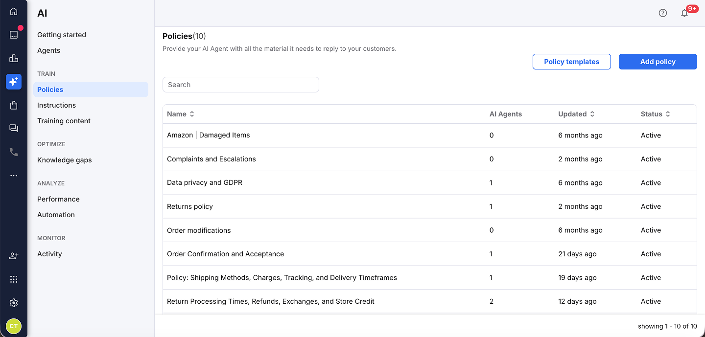 Policies are one of the most important tools customers can set up in the AI Agent. They act as the rulebook that tells the AI how the business works - for example, the time window for customers returning an item, what shipping methods are offered, what counts as a warranty issue, or when an order can be cancelled.