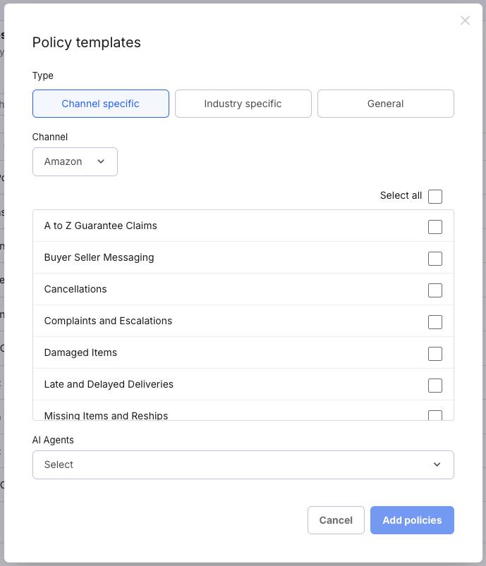 If more than one policy matches, the AI Agent will use the most specific policy, e.g., it will choose to use Amazon-US rules in preference to a general return policy.
