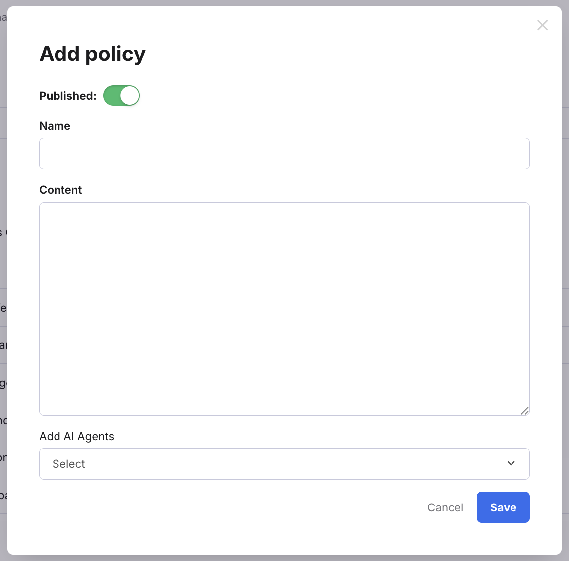The slider is enabled by default, which means the policy will be available for the AI Agent to use as soon as it is saved. - Name