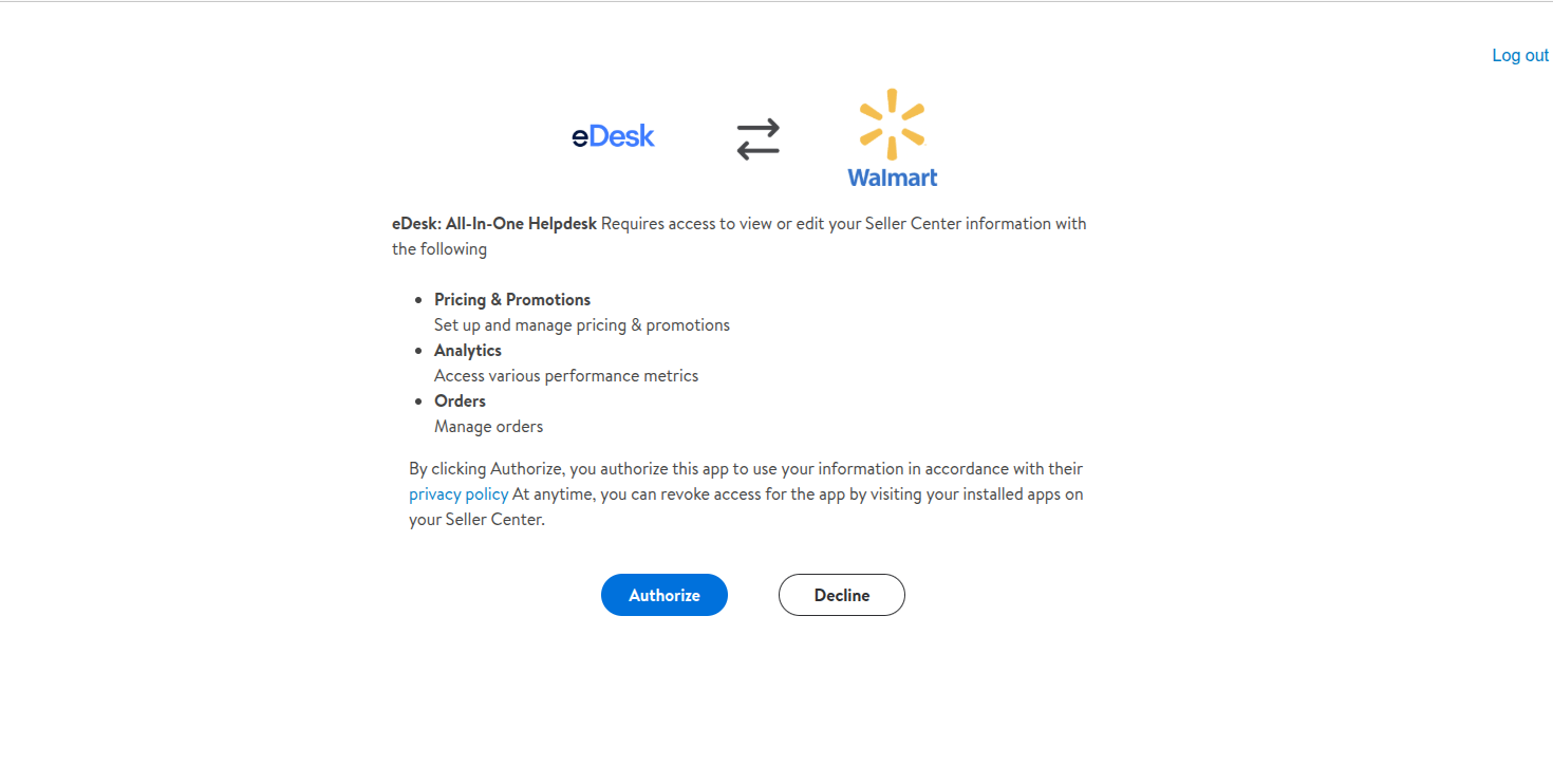1. You'll be redirected to Walmart where you'll be asked to Authorize eDesk